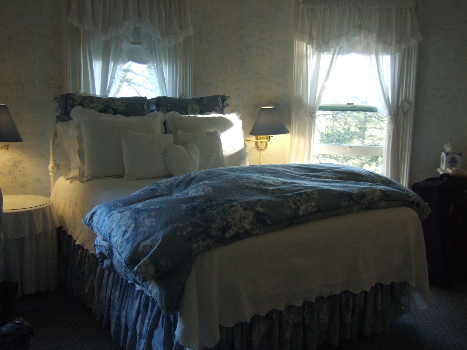 We stayed in The Meadow, a room decorated in blue, Victorian-style. The little push-up windows and nearby tree reminds me of one of my beloved childhood books,